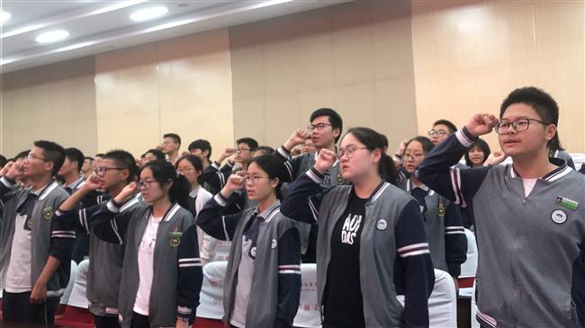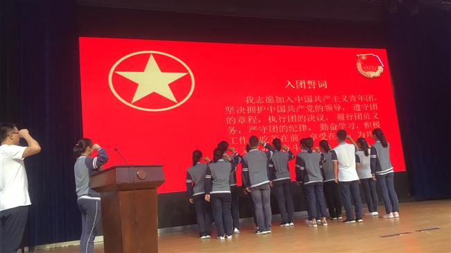 在高二(15)班老团员程欣宁的带领下,新团员右手握拳,在团旗下庄严宣誓。新团员代表高一(1)班牛凯文、老团员代表高二(1)班沈玉分别作表态发言。