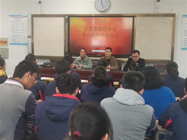 11月19日上午,宿迁中学团委在西阶梯教室举行爱心助学金发放仪式。校党委委员王振文、团委书记陆小利,团委委员左仁部、王俊方以及受助的70余名学生出席了仪式。