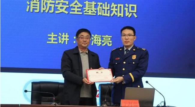 讲座开始前,宿迁中学党委副书记王勋代表学校聘请于海亮同志担任宿迁中学校外消防安全辅导员,同时颁发了聘书。
