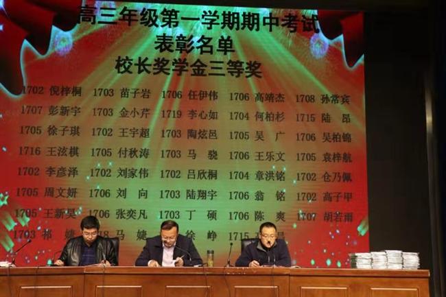 会上,高三年级实验部副主任吴绍峰首先宣读了对期中考试获奖学生的表彰决定,并对校长奖学金和综合考评特等奖获得者进行了现场颁奖。接着,他从宿舍、环境卫生、两操、安全等方面总结了上半学期的德育常规管理工作,点出亮点、指出不足,他要求各班级仍需抓好常规管理工作,为成绩的提升提供保障。