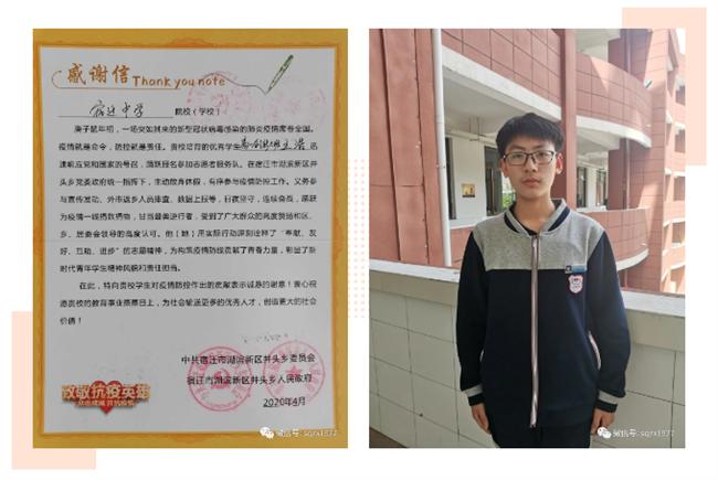 近日,我校接到中共宿迁市湖滨新区井头乡委员会、宿迁市湖滨新区井头乡人民政府的一封感谢信,信中对我校高一创新6班王浩同学,在今年寒假疫情期间积极参与疫情防控工作给与了高度评价,表示了诚挚的感谢。