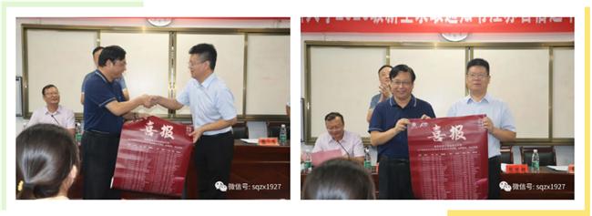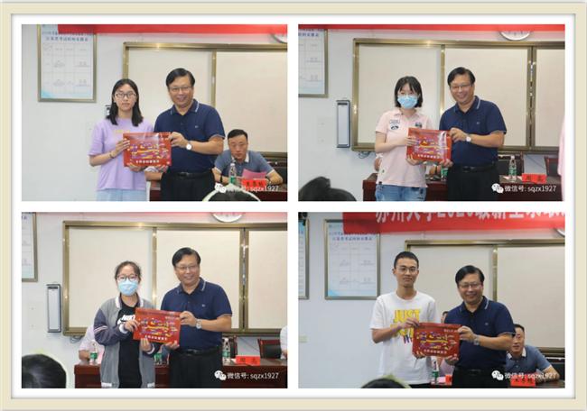 张校长从苏州大学党委常委、总会计师周高手中接过苏州大学喜报,并代表宿迁中学、53名被录取的新生和家长对周校长一行表示欢迎和感谢。