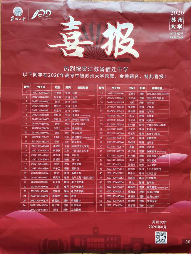 2020年8月22日上午,苏州大学党委常委、总会计师周高,校长办公室副主任王季魁等一行3人到宿迁中学颁发2020级新生录取通知书。宿迁中学校长、党委书记张德超,副校长王爱斌、党委委员徐士权,2020届高三年级主任邱绍军、陈柱,被苏州大学录取的53名新生及部分家长代表参加了本次活动。颁发仪式由副校长王爱斌主持。
