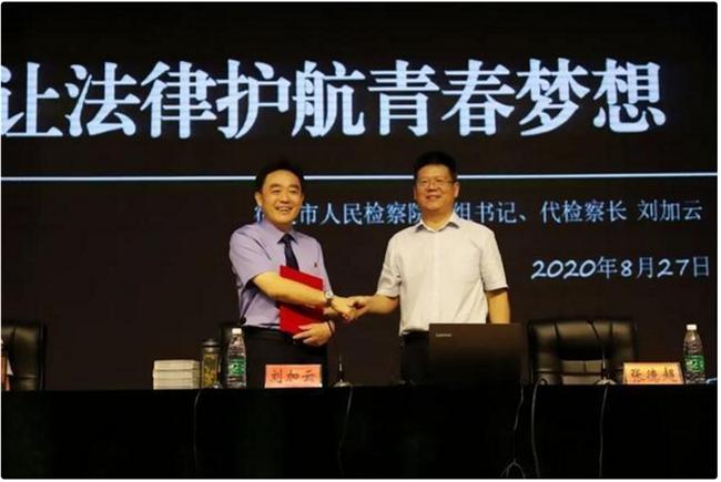 刘加云代检察长向张德超校长赠送校园法治教育系列片《青春正步走》。