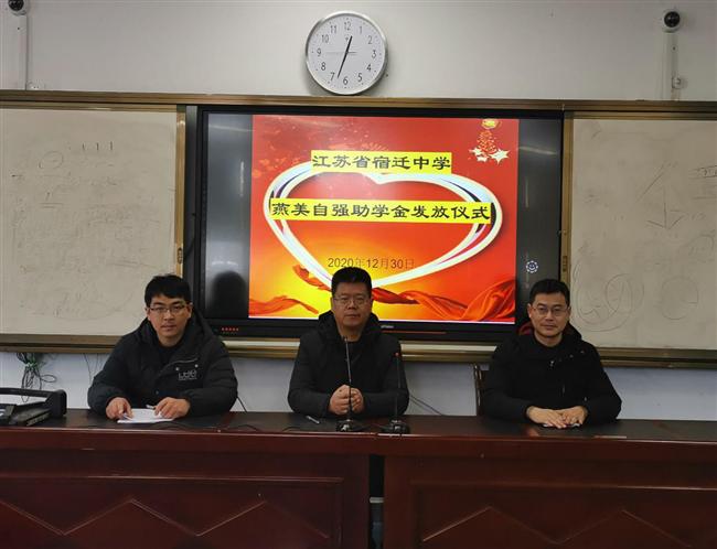 12月30日上午,“燕美自强”助学金发放仪式在宿迁中学东阶梯教室举行。宿迁中学党委书记、校长张德超,校党委委员王振文,校团委副书记朱明航、魏学广以及受助的学生参加了此次仪式。发放仪式由校党委委员王振文主持。