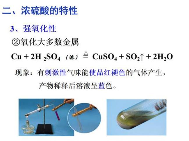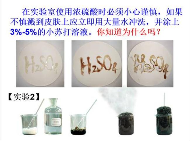 通过在烧杯中加入适量蔗糖,再滴加3~10滴浓H2SO4,学生亲身体验和感受实验全过程:蔗糖慢慢由白色变黑色,体积不断膨胀,呈疏松多孔的海绵状。有刺激性气味产生,并放出大量的热。启发学生思考,色?态?味?过后并作一一点评归纳,对学生理解浓硫酸的脱水性比较直观。通过取一定体积的浓硫酸,放置在空气中一段时间,体积增大。向胆矾中加入一定量浓H2SO4,胆矾由蓝色逐渐变成白色。对学生理解浓硫酸的吸水性比较直观。同时,成功的实验,激发学生学习化学的兴趣。