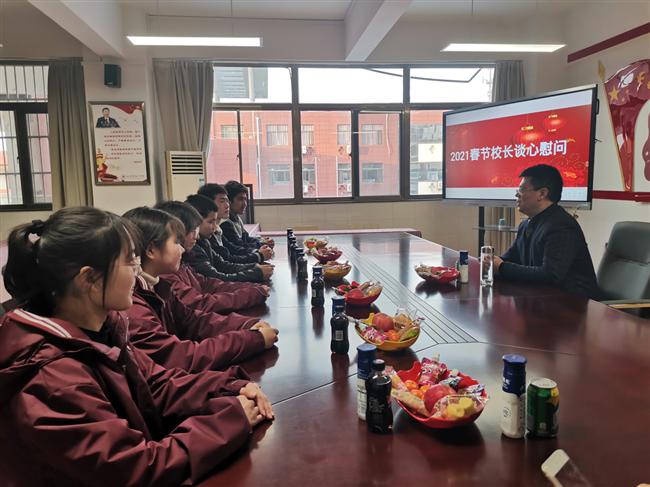 2月8日(腊月二十七)下午,宿迁中学党委书记、校长张德超老师亲自采购了孩子们爱吃的水果、点心,率先与高一(1)班学生代表促膝谈心。张校长对同学们提出殷切希望,鼓励学子们自强不息、刻苦学习,珍惜党的好政策,争取以优异的成绩,回报亲人、回报社会。