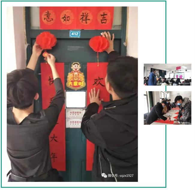 腊月二十九、三十,天山学子们在老师的指导下写春联,贴春联,挂灯笼,除夕晚上师生一起看春晚。