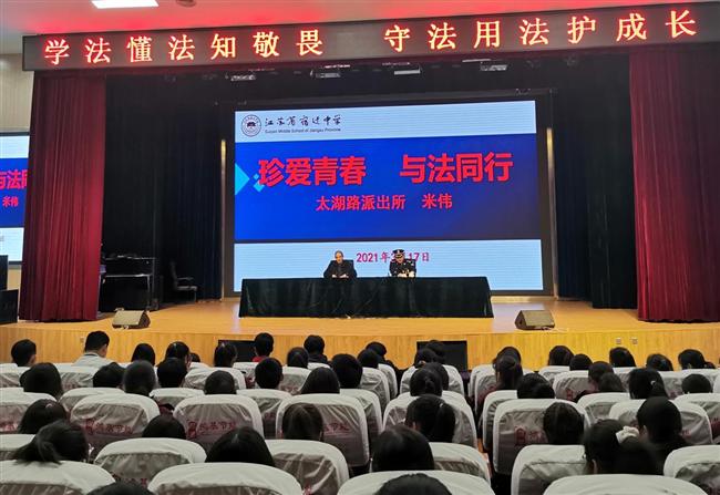 为了促进新疆内高班学子学习法律知识,增强法制观念,自觉遵纪守法,学会用法律加强自我保护,做一个知法、守法的好学生,3月17日下午,宿迁中学邀请了宿城区太湖路派出所民警米伟作了一场以《珍爱青春 与法同行》为题的法制教育报告,新疆部高一、高二年级全体学生,班主任和内派老师参加了此次活动。