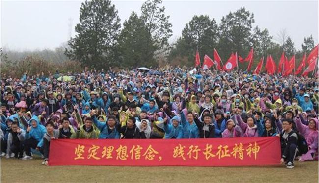 师生们迎着春风,踏着细雨,一路上,军旗飞舞,歌声不断。口号声加油声,此起彼伏,气势磅礴。他们带着红军的长征精神,一路坚持;带着缅怀先烈、追忆战争岁月的赤诚之心,携手同行,经过三个小时的跋涉,抵达活动场地——三台山国家森林公园。