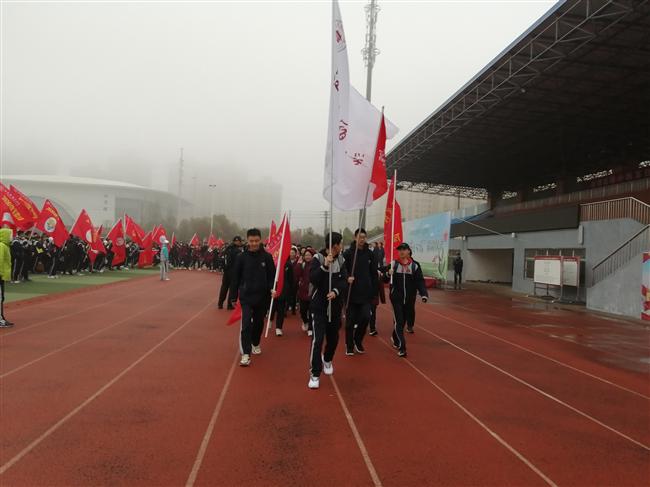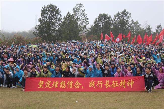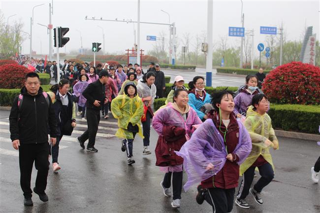 学校党委书记、校长张德超宣布远足活动正式开始后,同学们高举旗帜,迈着整齐有力的步伐,向目的地进发。