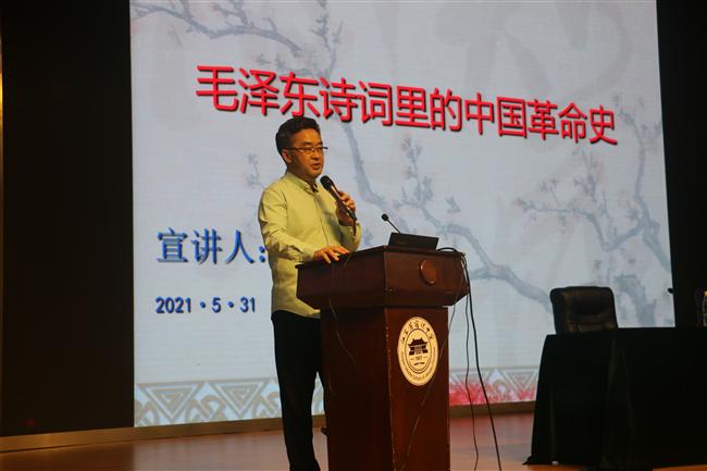 为落实党史学习教育相关部署,5月31日晚,宿迁中学邀请省作协副主席祁智先生到校开设了题为《毛泽东诗词中的中国革命史》的报告会。报告会由校党委委员、副校长纪文杰主持。