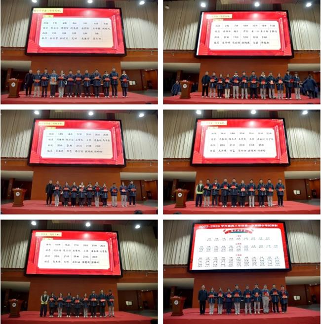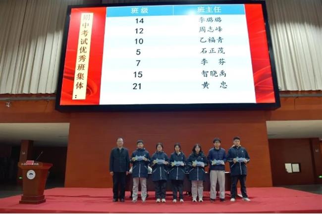 王腾飞宣读表彰名单,对在期中考试中表现突出的“优秀班级”和“先进个人”进行表彰