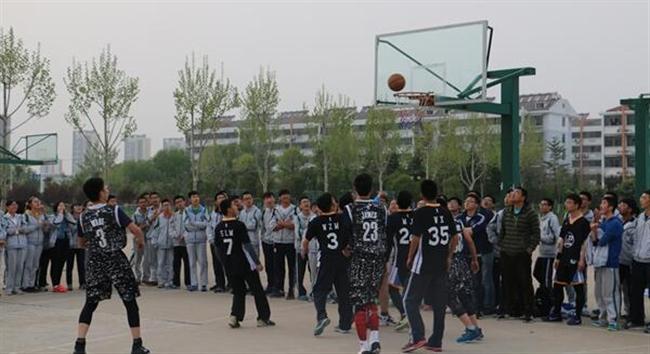 4月上旬,我校举行了第九届篮球联赛。高二年级全体班级参加了比赛。校领导张维国、纪文杰、王爱斌等观看比赛。