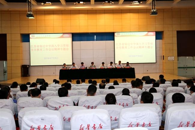 王孝玲校长就学习和落实全市教育工作会议精神作动员讲话。她说,此次教育工作会议,是在决胜攻坚全面小康开局之年、教育现代化建设进入关键阶段召开的,具有十分重要的意义。她说,此次会议内容充实、目标明确、任务清晰,极具前瞻性,对于宿迁教育有着很强的指导意义。市委、市政府对教育的高度关注,对教育的深谋远虑既是宿迁教育过去跨越发展的基石,更是宿迁教育未来全面发力、纵深推进的保障。王校长说,学习和贯彻落实会议精神,就要求我们要努力成为有理想信念、有道德情操、有扎实学识、有仁爱之心的“四有”好教师,要努力成为师德高尚、业务精良、善于创新、勇于实践、受学生喜爱的好教师,要努力培养出素质全面、特长鲜明、人格健全,具有发展力的宿中学子。围绕“到2018年,二本上线率突破90%,一本上线率达到50%,北大、清华等985高校录取人数不少于150人”的目标,增进目标认同,形成发展合力,努力使学校办成市内示范、全省一流、全国知名的中华名校,成为引领宿迁基础教育发展的一面旗帜。