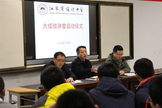 1月2日,在西阶梯教室举办宿迁中学“大成微讲堂”的启动仪式。为给全校同学提供一个展示自已智慧与才情、胆识与魅力的机会,丰富学校大成文化内涵,推进“高中生生涯导航工程”项目深入实施,在校长室、校党委的关心和支持下,政教处决定开办“大成微讲堂”。