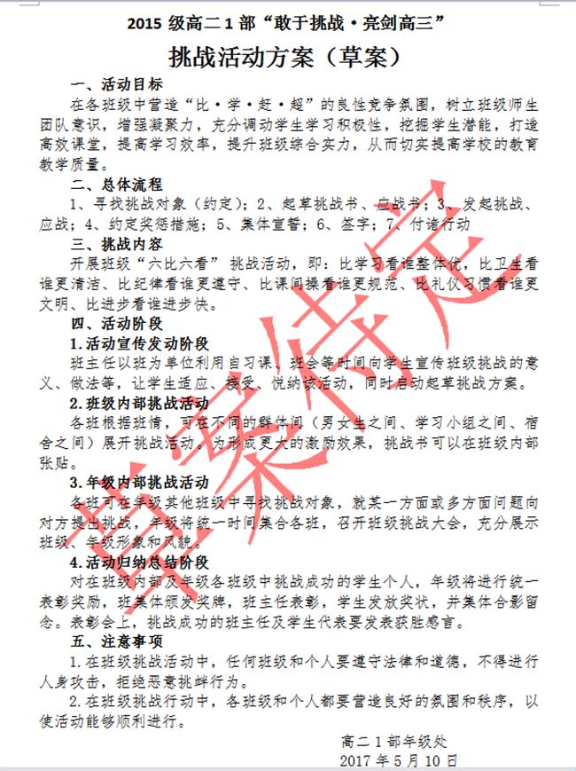 2015级高二1部启动“敢于挑战·亮剑高三”班级挑战活动(方案)