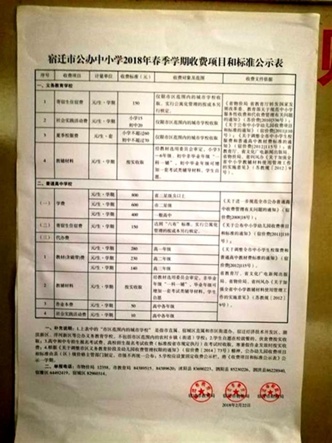 宿迁市公办中小学2018年春季学期收费项目和标准公示表