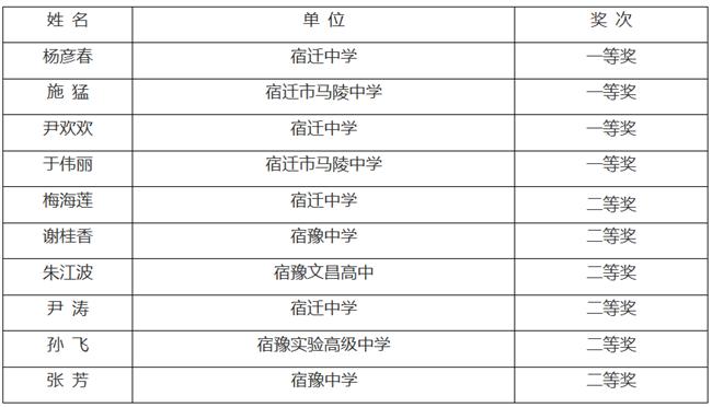根据宿教研〔2017〕018号、〔2017〕019号文件精神,我室分别于3月21日、23日在宿迁市钟吾国际学校、宿迁中学,举行了市直片初、高中综合实践优质课评比活动。经专家评审,评出一等奖8名,二等奖12名。现将结果公布如下: