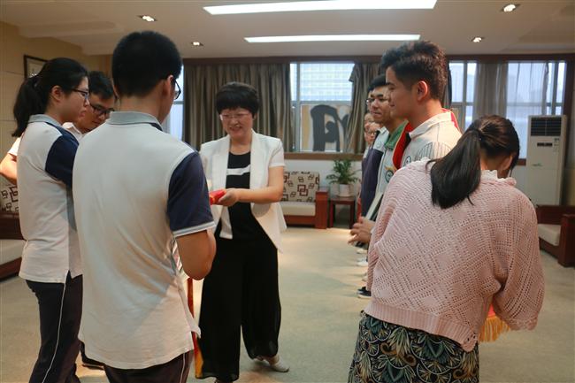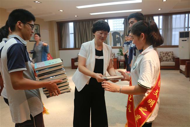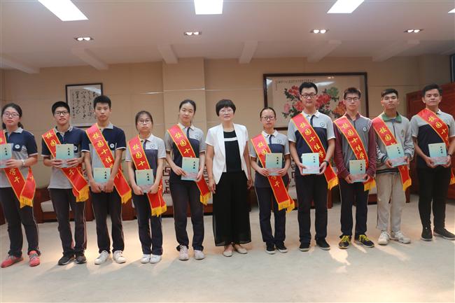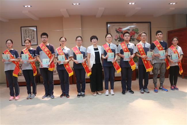 王勋书记宣读了《关于表彰2018届优秀毕业生的决定》和《关于表彰2017-2018学年度第二学期校园十佳学干、文明之星的决定》。王孝玲校长在明德楼五楼会客室给获奖学生佩戴上了彩带,颁发了荣誉证书、奖金,还和他们合影留念,向他们表达了衷心的祝贺,同时也提醒他们要继续努力,再创辉煌。