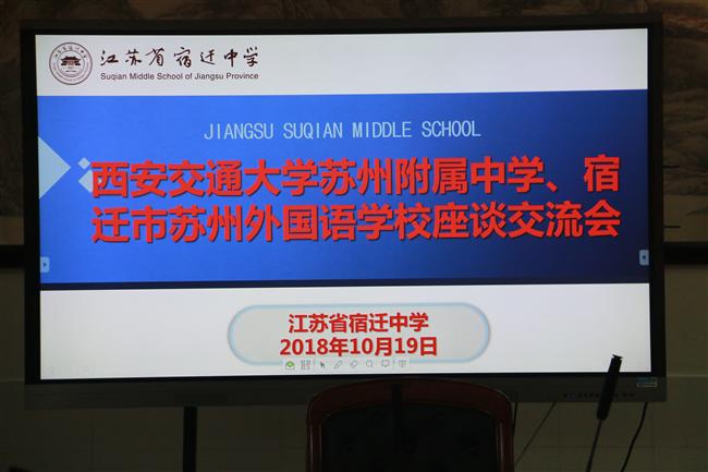 10月19日上午,西安交通大学苏州附属中学校长周晓阳、宿迁市苏州外国语学校校长徐学根一行7人到宿迁中学访问交流。