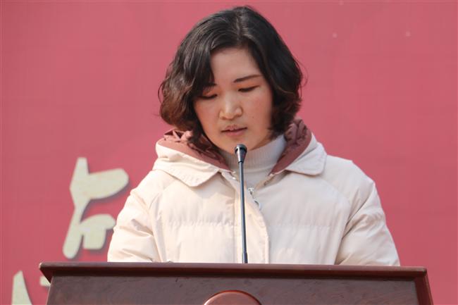 优秀教师乙福青代表高三年级全体老师发言。她希望学生学会思考,学会奋斗,学会担当,学会承担和克服人生路上的一切困难与挫折。面对繁重的学习、生活,希望始终保有“天生我才必有用”的信心、 “吹尽黄沙始见金”的毅力和“直挂云帆济沧海”的勇气。最后乙老师代表全体教师表态:将忠于职守,潜心备课,努力完善教学方法!将和所有的高三学生一起,争分夺秒,奋斗百日,冲刺六月!
