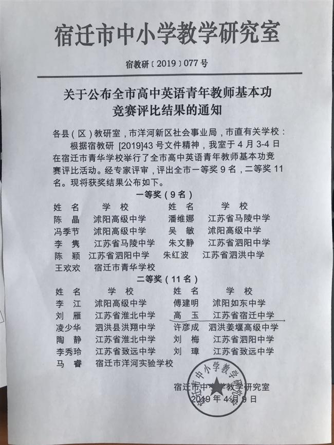 祝贺高玉老师荣获全市高中英语青年教师基本功竞赛评比二等奖