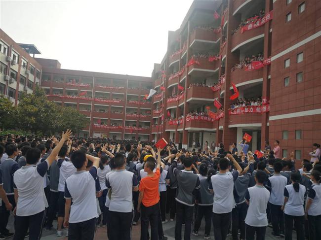 高三学子热血沸腾,摇旗回应,齐声喝彩,掌声不断。